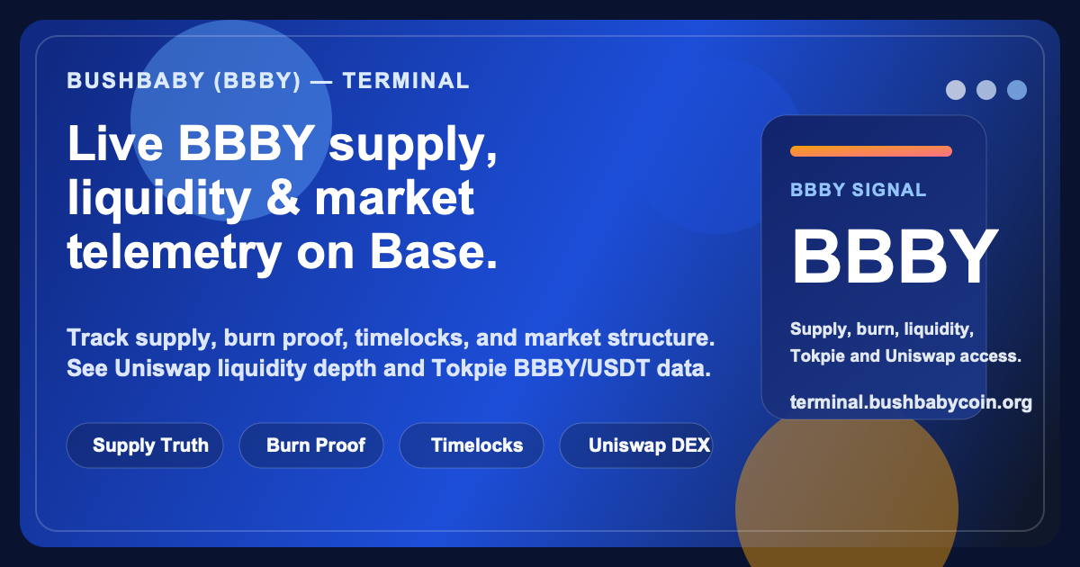 The BushBaby Terminal highlights BBBY burn status, tradable circulating supply, controlled team wallet exclusions, and treasury timelocks so effective float is easier to understand.